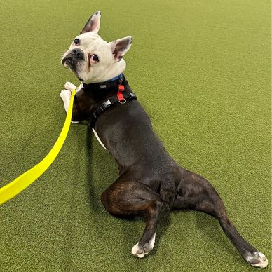 Picture is Winston at Rally Obedience class having to wait his turn but he’s impatient and tries to sneak and crawl his way onto the course