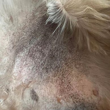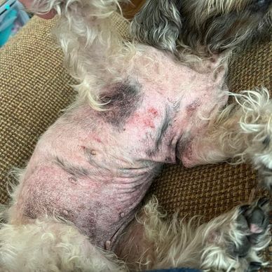 She’s very, very itchy everywhere. She’s constantly either rubbing her face on the furniture or she has her face buried in her groin area biting licking chewing. Her groin is all black with hair loss and very hot to the touch.