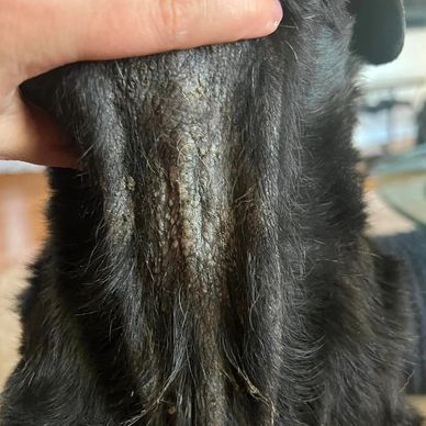 He is severely itchy, he gets hard crusty patches on his skin that over time fall off and he’s left with a bald patch. The hair usually grows back within a few weeks. He’s very dry/dandruffy but we don’t pull the crusty hair/skin off, we let it fall off so we don’t create sore patches or open wounds.
