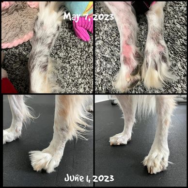 I wanted thank you for all of your advice and give you an update on Brittany, and ask a quick question. I’d gotten your advice on her skin issues, as well a full CCL rupture. We switched her diet to Dr. Harvey’s allergy food (salmon recipe) on March 15, 23. I started her on Cessorex for the skin about a week or so later, and after she ruptured her CCL I started her on Voltrex (April 20th). We were able to find an integrative that was 4 hours away and took Brittany to see her May 15th. I’ll include a picture of the difference in her skin after seeing her. Her diagnosis was TCVM Diagnosis: Liver Yin Deficiency, Shen Disturbance; Western Diagnosis: Allergies, Torn ACL of LPL. She gave us a skin serum she formulated to use twice daily, started her on Jing Tang Tendon Ligament formula, and showed me some massages and ROM exercises to do at home. She suggested acupuncture, and we were able to find someone local to do that.