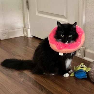 Spooky came to us as a stray in 2014, we don’t know her age but assume she is around 13-14 due to the dental disease she already had. She is very active and eats well.
